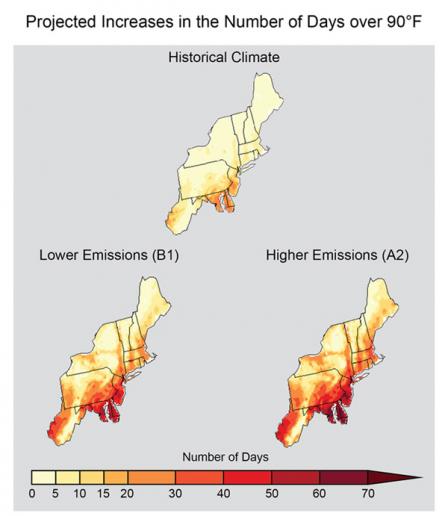 The annual number of days above 90°F is projected to increase, especially for southern portions of the Northeast region. This figure shows the average number of days with a maximum temperature of at least 90°F historically (1971-2000) and under two potential future scenarios (one with reduced greenhouse gas emissions [B1], and one with increases in emissions [A2]). Source: USGCRP (2014)[1]