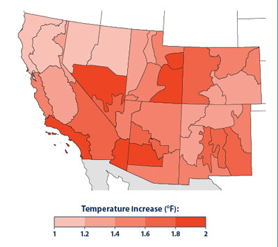 Average temperatures across the entire Southwest have increased in recent years, with some areas increasing by up to 2°F. This map shows the average temperature from 2000-2013 relative to the long-term average from 1895-2013. Source: US EPA (2014)[8]