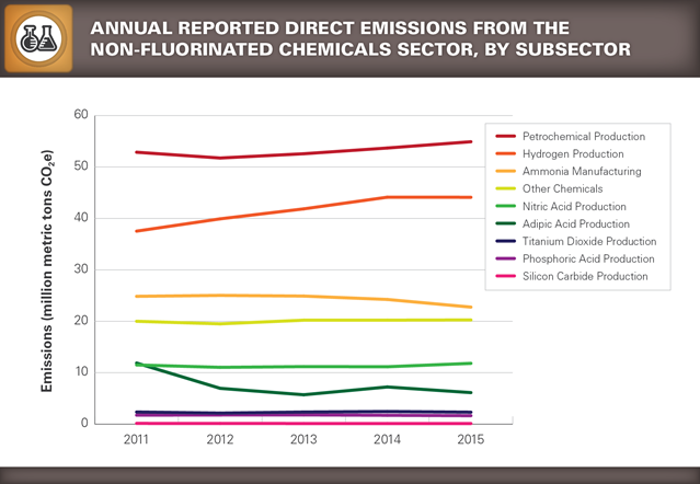 The chemical manufacturing sector consists of facilities that manufacture organic or inorganic chemicals. For this summary, the sector is broken down into facilities that produce fluorinated chemicals and non-fluorinated chemicals. The non-fluorinated chemicals subsector comprises facilities that produce adipic acid, ammonia, hydrogen (both merchant and non-merchant plants), nitric acid, petrochemicals, phosphoric acid, silicon carbide, and titanium dioxide. The fluorinated chemicals subsector comprises facilities that produce HCFC-22 (or destroy HFC-23) and other fluorinated chemicals. A more detailed description of these subsectors is provided below. A total of 463 chemicals facilities reported in 2015.